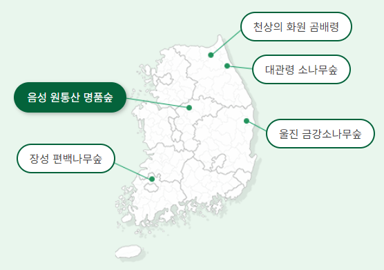 | 명품숲 | 음성 원통산, 장성 편백나무 숲, 천상의 화원 곰배령, 대관령 소나무숲, 울진 금강소나무 숲 | 5개소 |